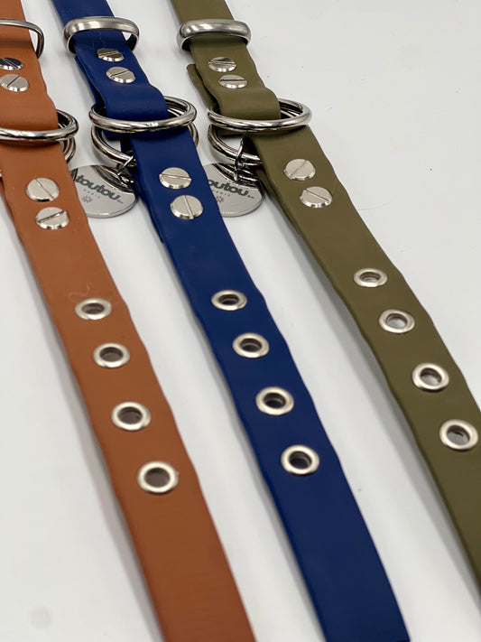 Chez Toutou&co Paris, nous utilisons des matériaux de haute qualité pour garantir la durabilité et le style de nos accessoires. Le Biothane, un matériau synthétique, est résistant, imperméable et facile à nettoyer, offrant une alternative durable et pratique au cuir. Nous utilisons également du paracord en nylon, un cordage ultra-résistant et léger, idéal pour des accessoires robustes et élégants. Nos boucleries sont en laiton ou en acier inoxydable, assurant solidité et résistance à la corrosion pour des accessoires à la fois fiables et esthétiques.