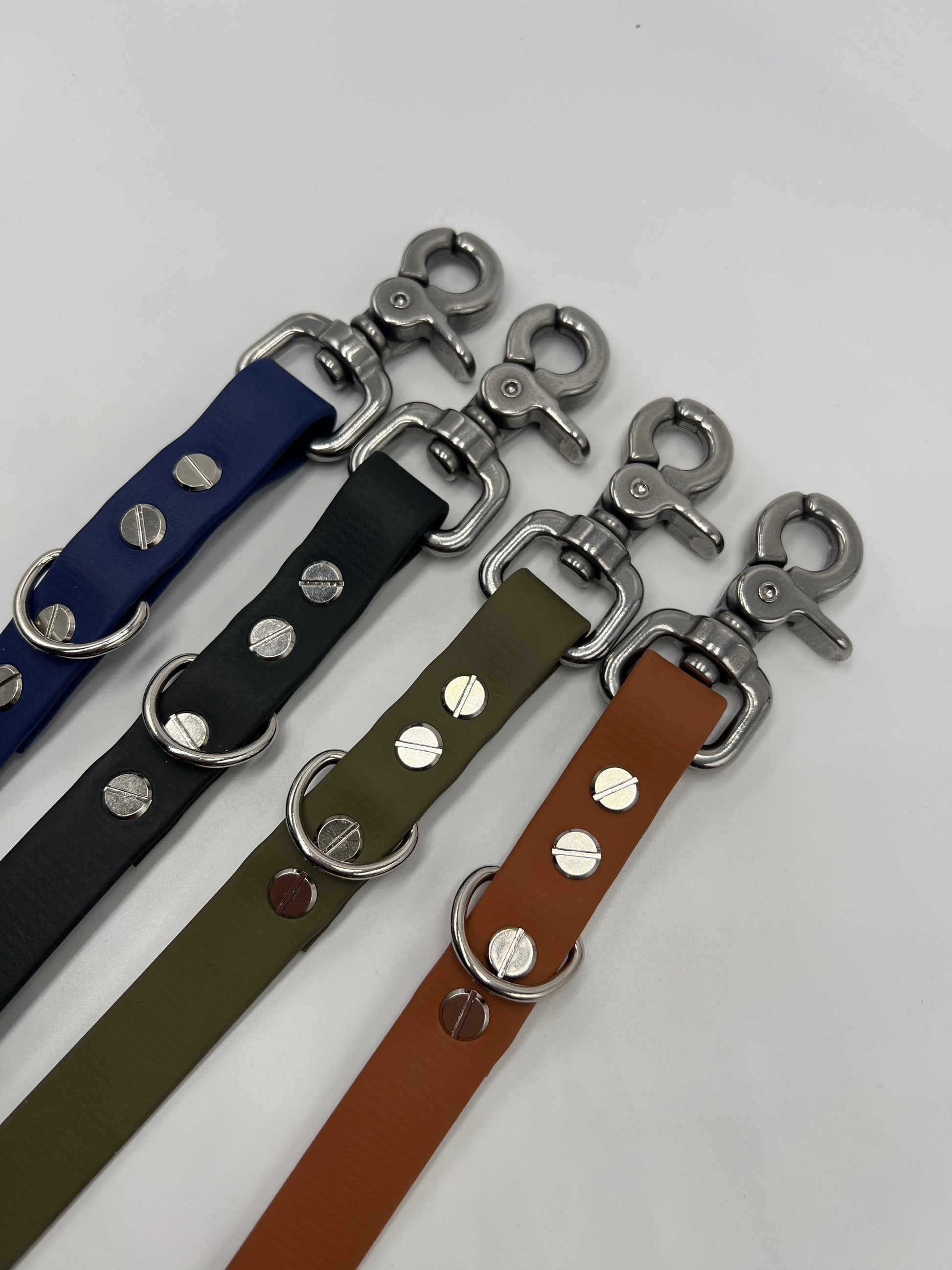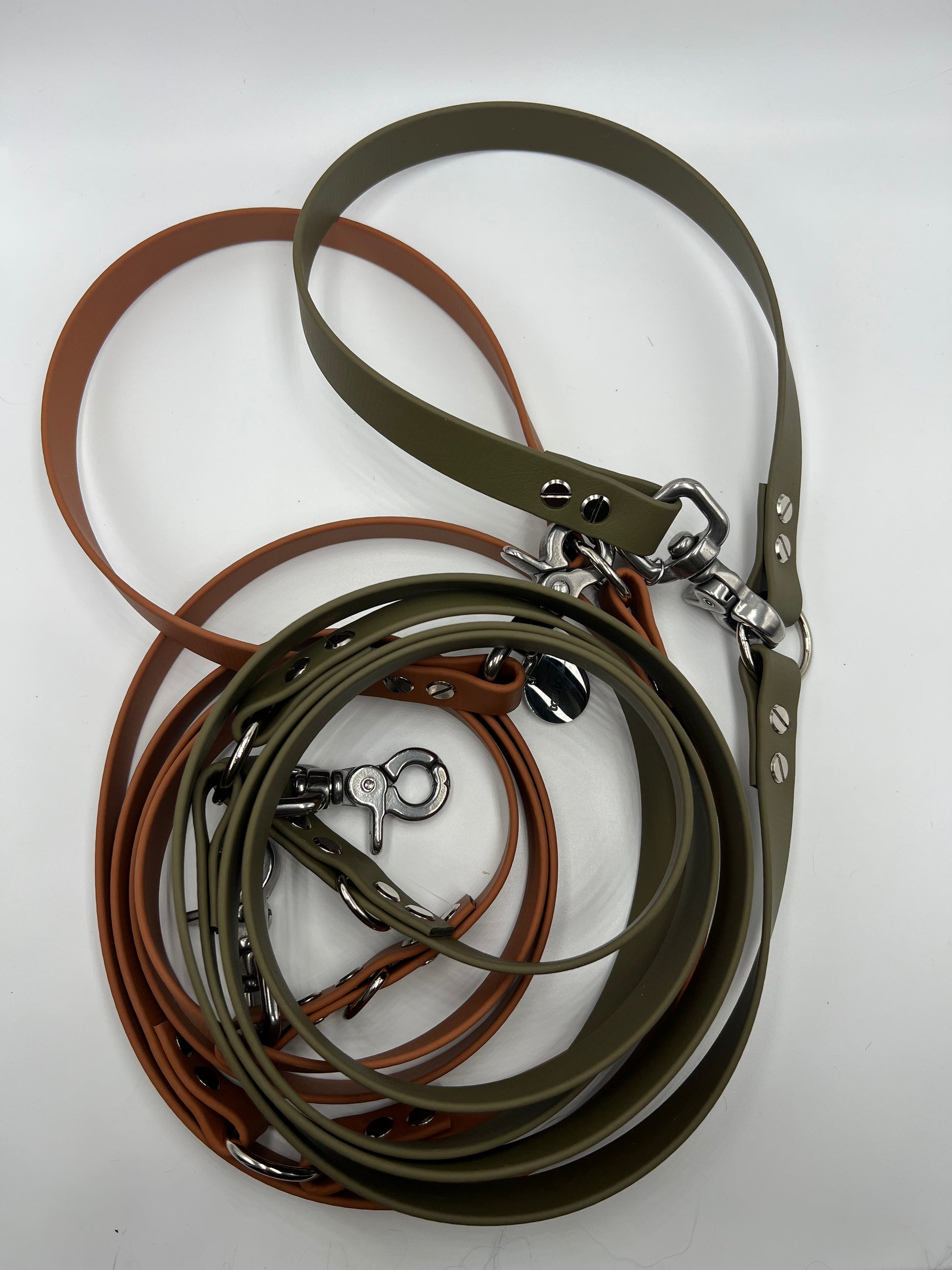 Nos accessoires sont fabriqués en Biothane, un matériau synthétique réputé pour sa durabilité et sa facilité d'entretien. Nous utilisons également du paracorde en nylon pour son incroyable résistance et sa flexibilité. Nos boucles et attaches sont en laiton ou en acier inoxydable, garantissant solidité et longévité. Chaque pièce est soigneusement conçue pour allier praticité, robustesse et élégance.