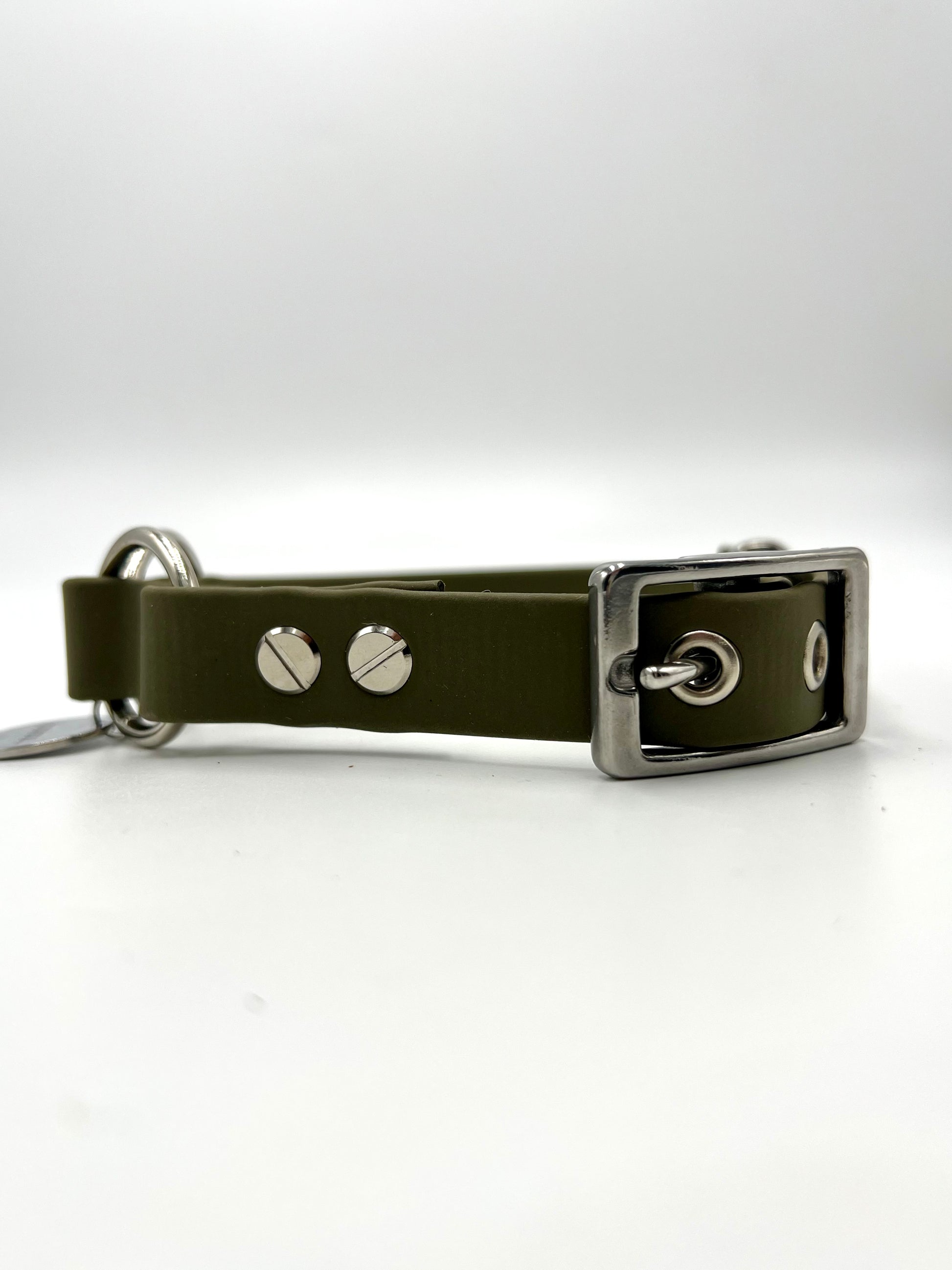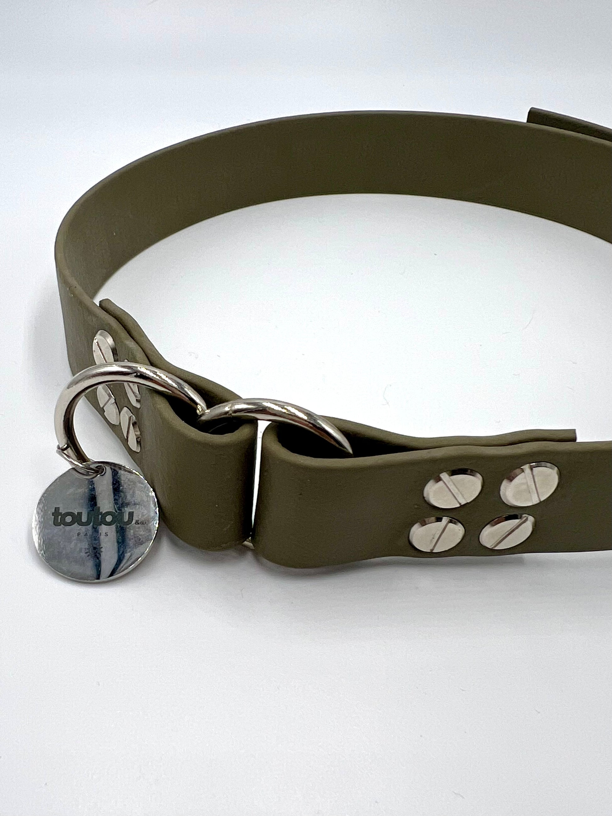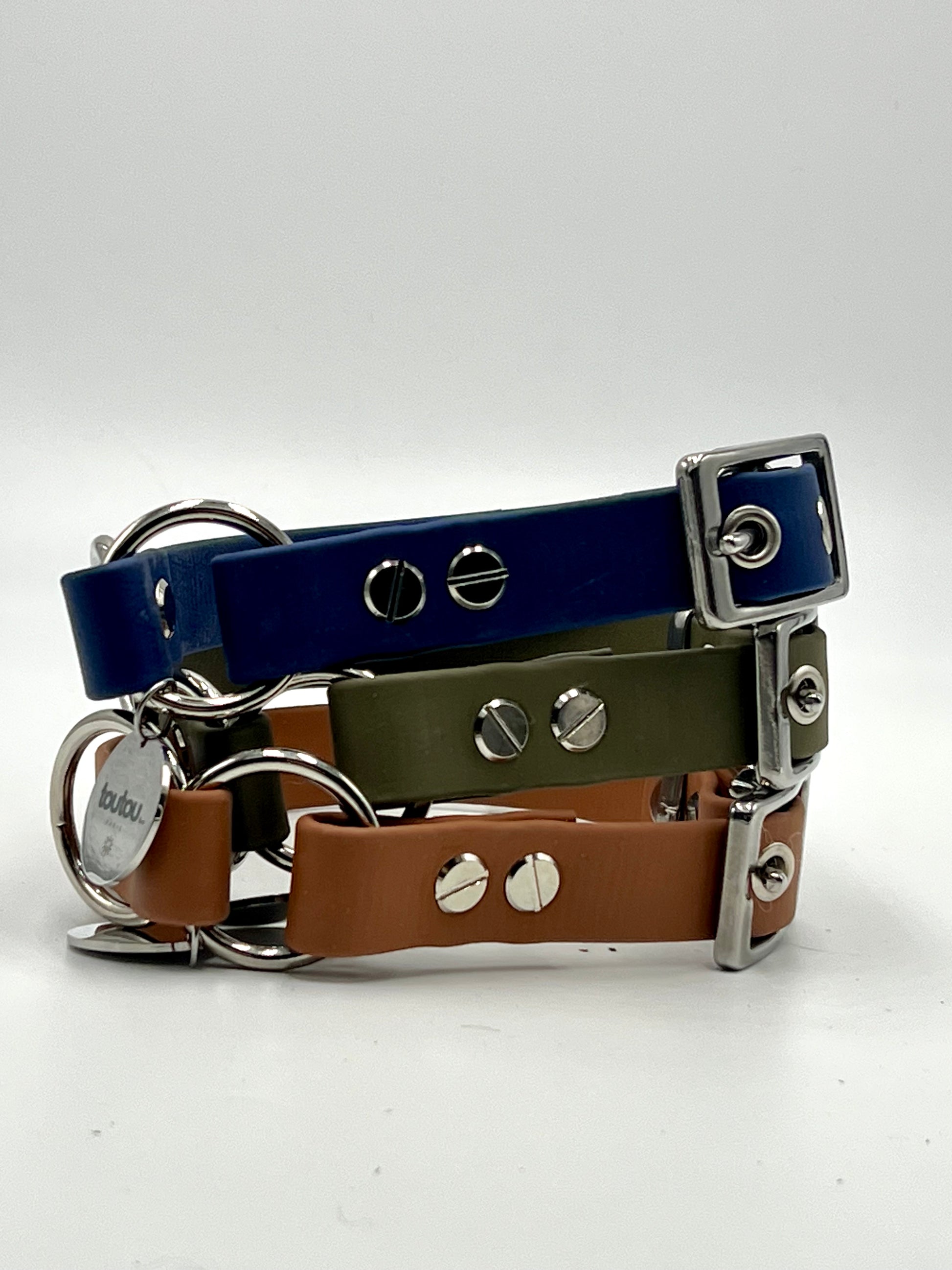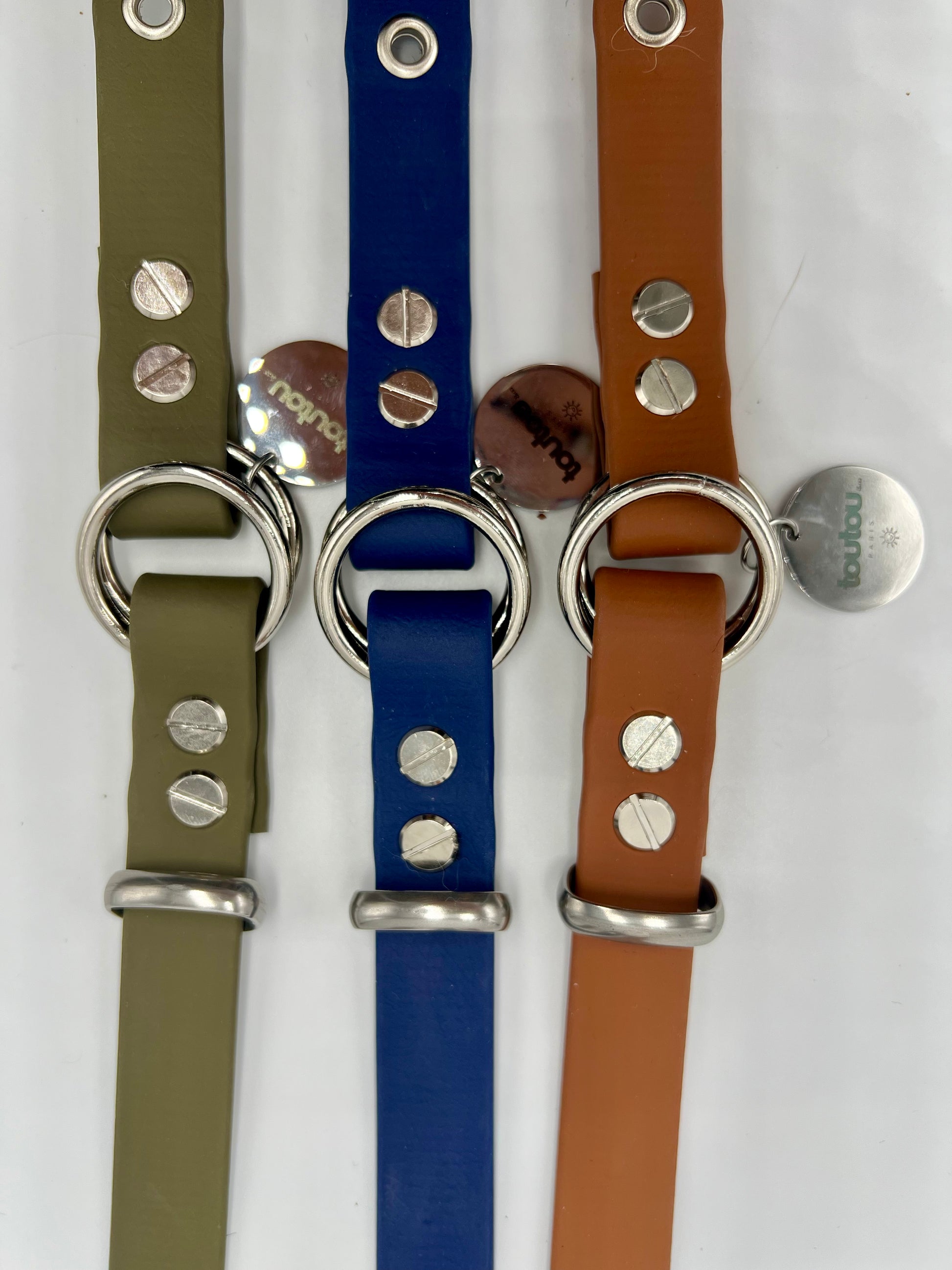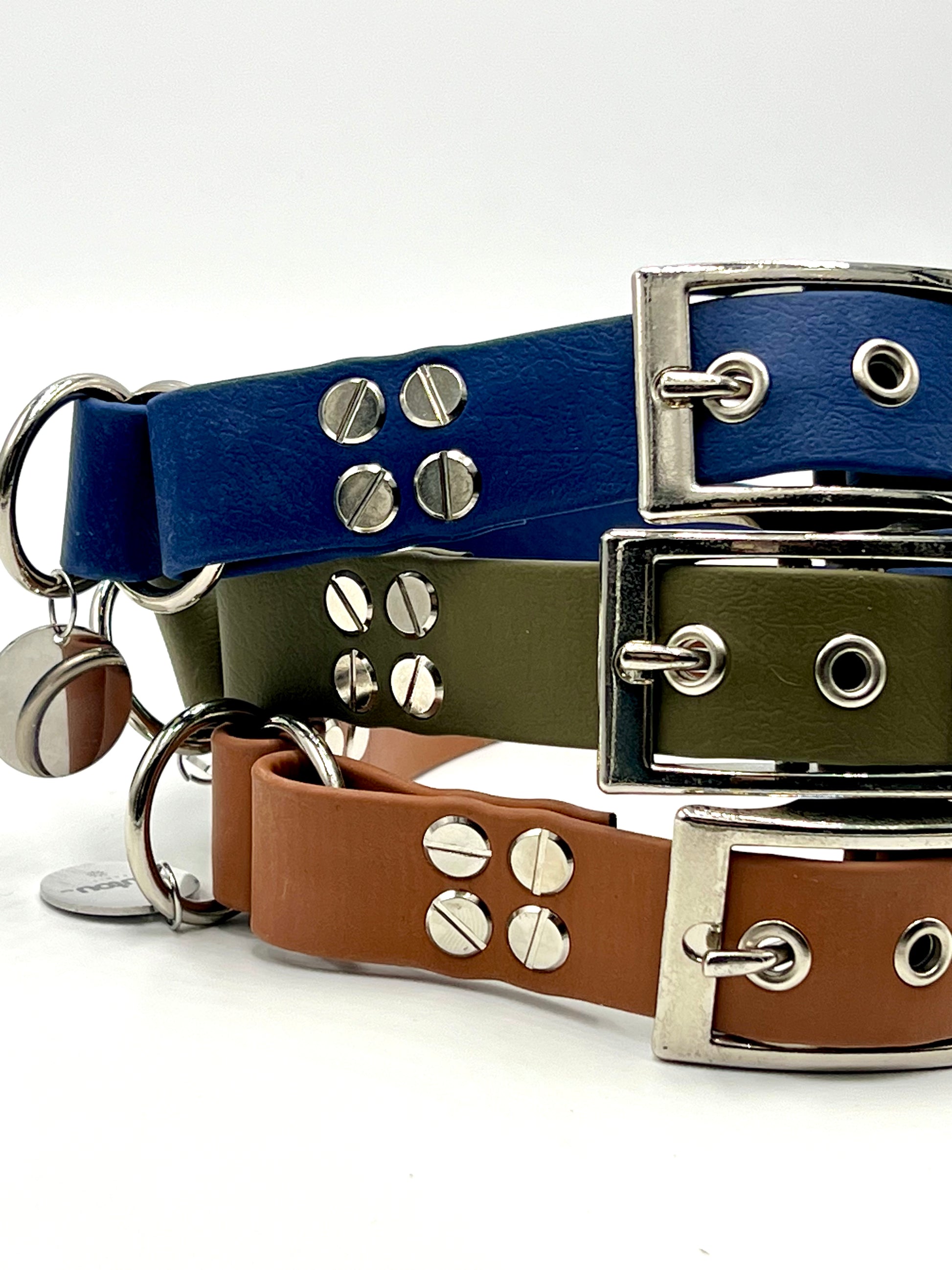 Fabriqué à la main en Biothane, un matériau reconnu pour sa durabilité exceptionnelle, son aspect élégant et sa facilité d’entretien, ce collier accompagnera votre compagnon dans toutes ses aventures ; du quotidien aux balades les plus mouvementées.